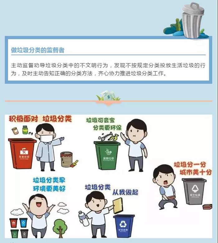 主動監督勸導垃圾分類中的不文明行為,發現不按規定分類投放生活垃圾的行為,及時主動告知正確的分類方法,齊心協力推進垃圾分類工作。
