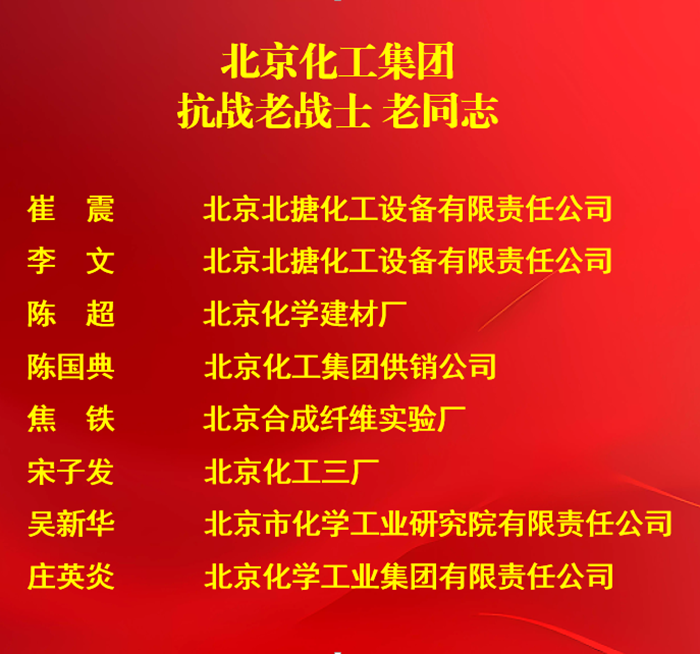 在紀(jì)念中國人民抗日戰(zhàn)爭暨世界反法西斯戰(zhàn)爭勝利 80 周年之際,黨中央、國務(wù)院、中央軍委為健在的抗戰(zhàn)老戰(zhàn)士、老同志授予“中國人民抗日戰(zhàn)爭勝利 80 周年紀(jì)念章”,北京化工集團(tuán)8位抗戰(zhàn)老戰(zhàn)士、老同志榮獲紀(jì)念章。