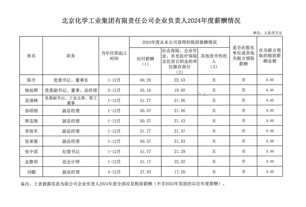 北京化學(xué)工業(yè)集團(tuán)有限責(zé)任公司企業(yè)負(fù)責(zé)人2024年度薪酬情況